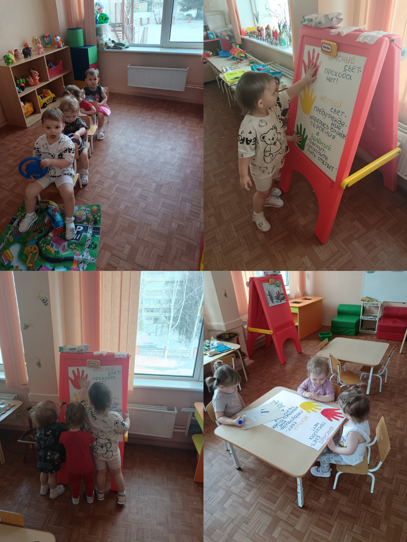 Формирование у малышей безопасного поведения на дороге с раннего возраста способствует снижению дорожно-транспортных происшествий среди детей.В нашей группе раннего возраста «Пчелки» в рамках декады ПДД проводились беседы- "Светофор", "Как я шел в детский сад",обыгрывались игровые ситуации по правилам безопасного поведения на улице. Малыши играли в подвижные игры: «Красный, желтый, зеленый», «Воробушки и автомобиль», "Поезд". Играли в настольные игры- "Забавные машинки", "Что изменилось". В сюжетных играх таких как, «Водитель и пешеходы», «Автобус» дети узнали, кого называют водителем, пешеходом и пассажиром.Создали коллективную аппликацию плакат по дорожной безопасности и решили подарить его ребятам старшей группы. Для родителей проведена консультация "Перевоз несовершеннолетних в автомобиле".